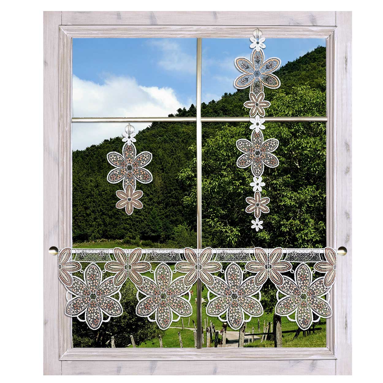 Verwandeln Sie Ihren Ausblick in ein florales Kunstwerk. Die Girlande Blütenzauber besticht durch ihre detailreiche Spitzenstickerei und bringt den charmanten Landhaus-Stil direkt in Ihre Wohnräume. Gefertigt aus Echter Plauener Spitze unter der Marke Design-Studio-Drechsler, steht dieses Fensterbild für hochwertige Handwerkskunst aus Deutschland. Das harmonische Zusammenspiel aus Beige und Braun verleiht jedem Raum eine warme, einladende Atmosphäre.